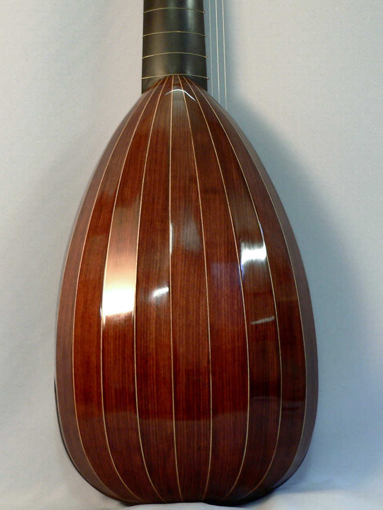 Un bel guscio a poche doghe adatto per arciliuti e tiorbe di grandi dimensioni, la tavola armonica ha una superficie ampia che conferisce un’ottima sonorità, il grande volume della cassa rafforza e dona grande dinamica alle corde gravi restando molto comodo per il musicista. Particolarmente indicato per strumenti per il basso continuo.